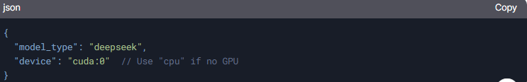 Most models require a configuration file (e.g., config.json). Edit this file to match your hardware: